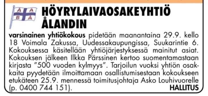 Höyrylaivaosakeyhtiö Ålandin yhtiökokous pidetään maanantaina 29.9. klo 18 Voimala Zakussa, Suukarintie 6. Kokouksessa käsitellään yhtiöjärjestyksessä mainitut asiat. Kokouksen jälkeen Ilkka Pärssinen kertoo suomentamastaan kirjasta "500 vuoden kylmyys".